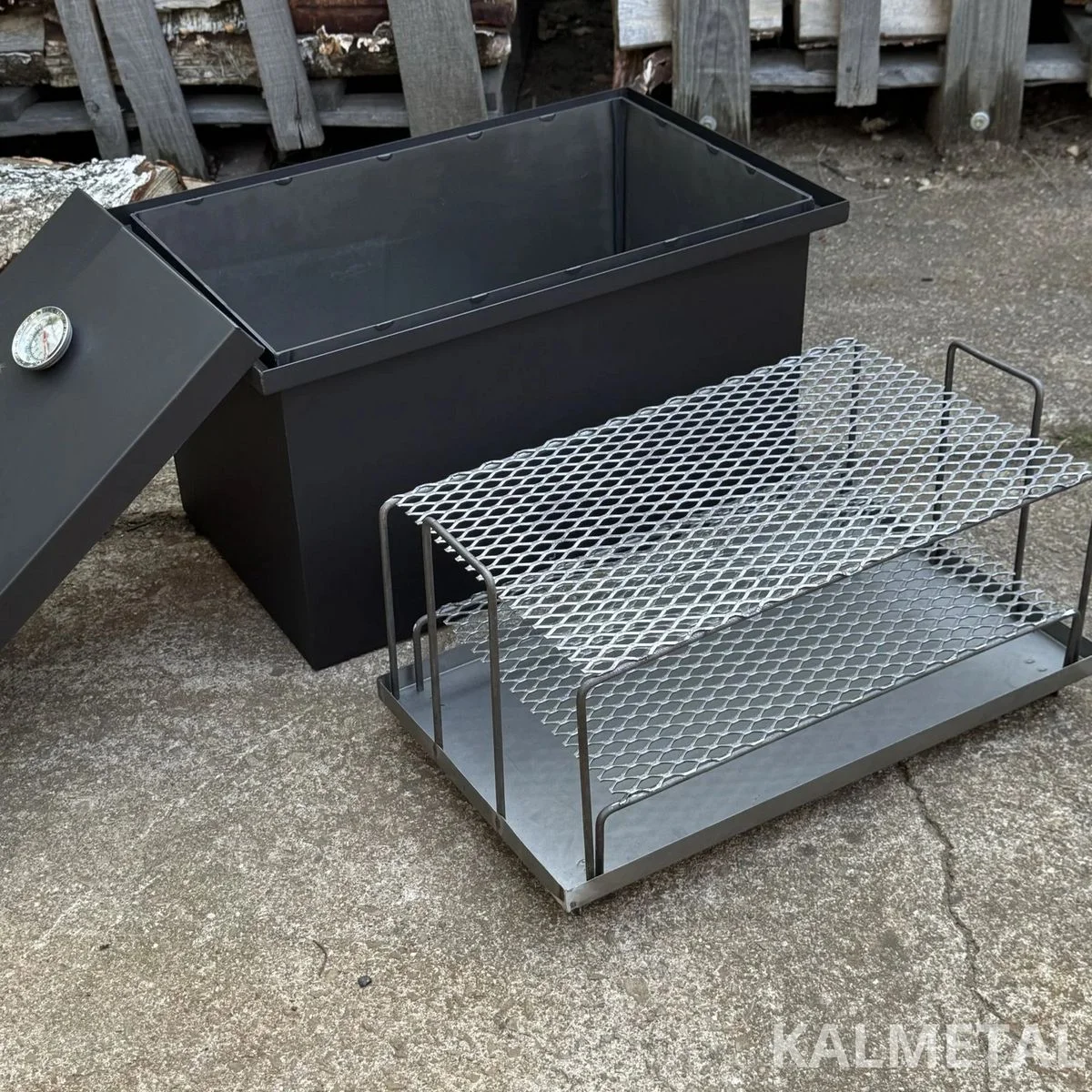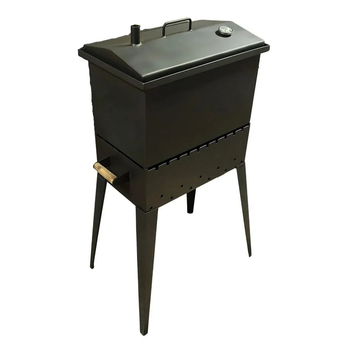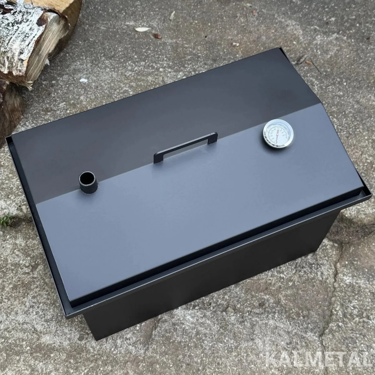 Equipped with a water damper! Around the top edge of the smoker, there is a groove that, when filled with water or sand and the lid is closed, prevents any smoke from escaping through the edges. All smoke exits only through the chimney.