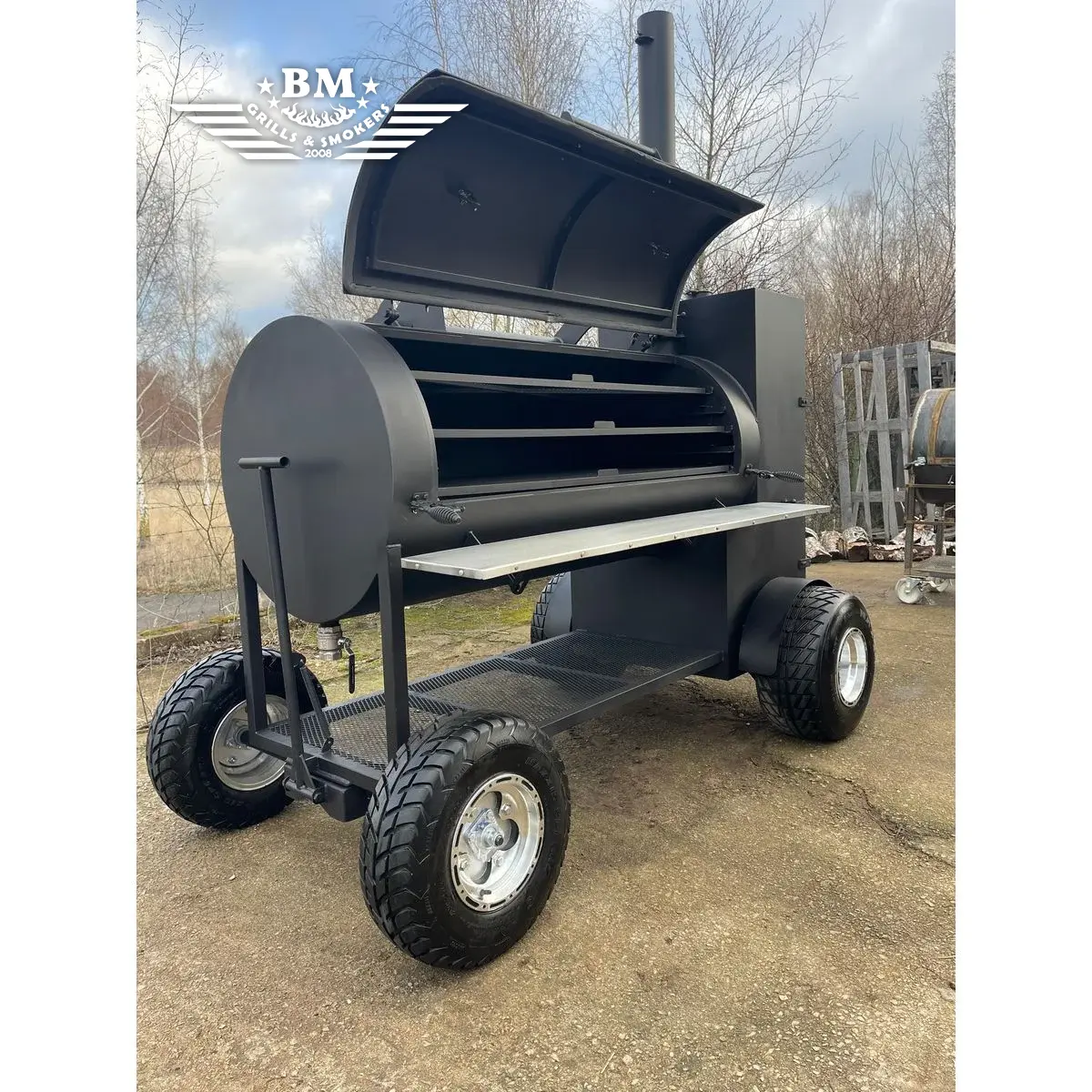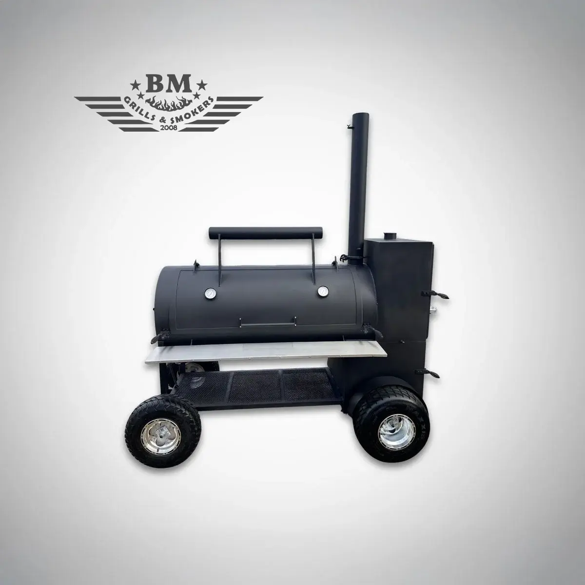 - The smoker is mounted on a sturdy square steel frame with large wheels (with brakes)