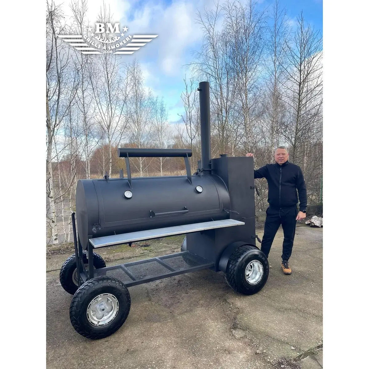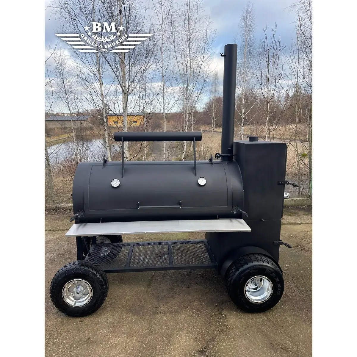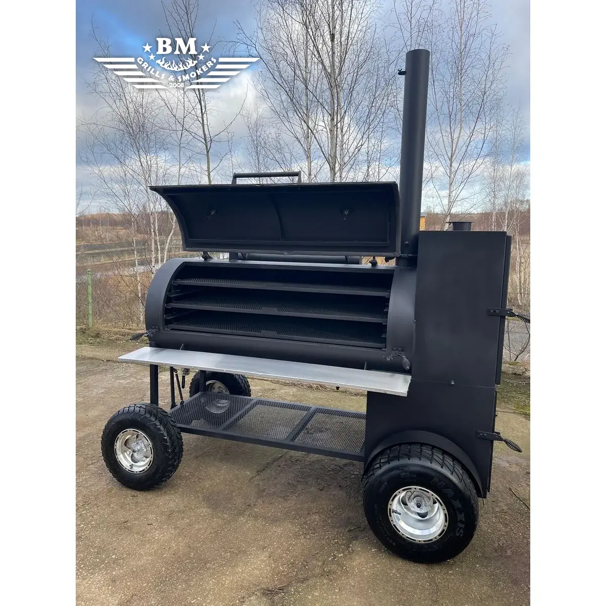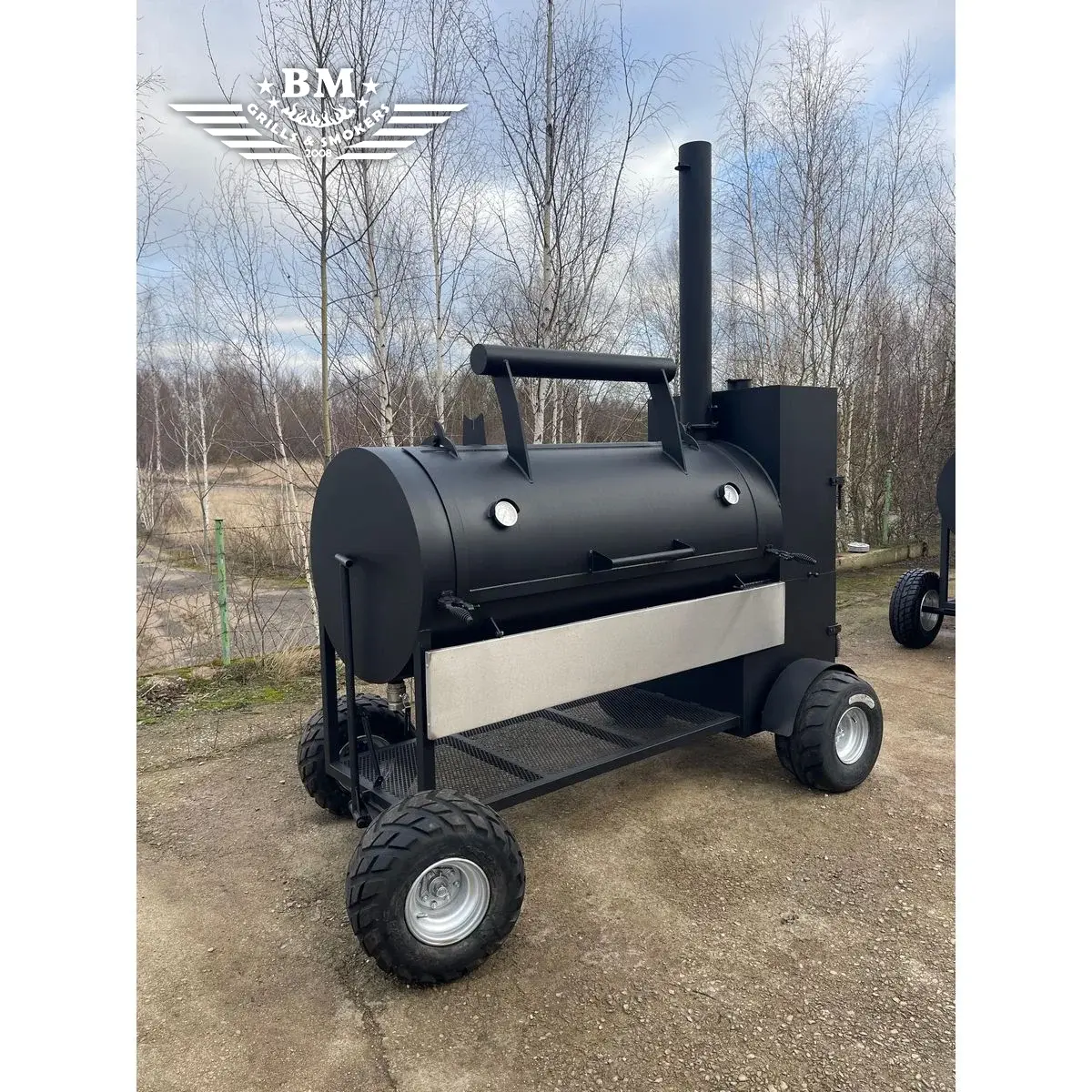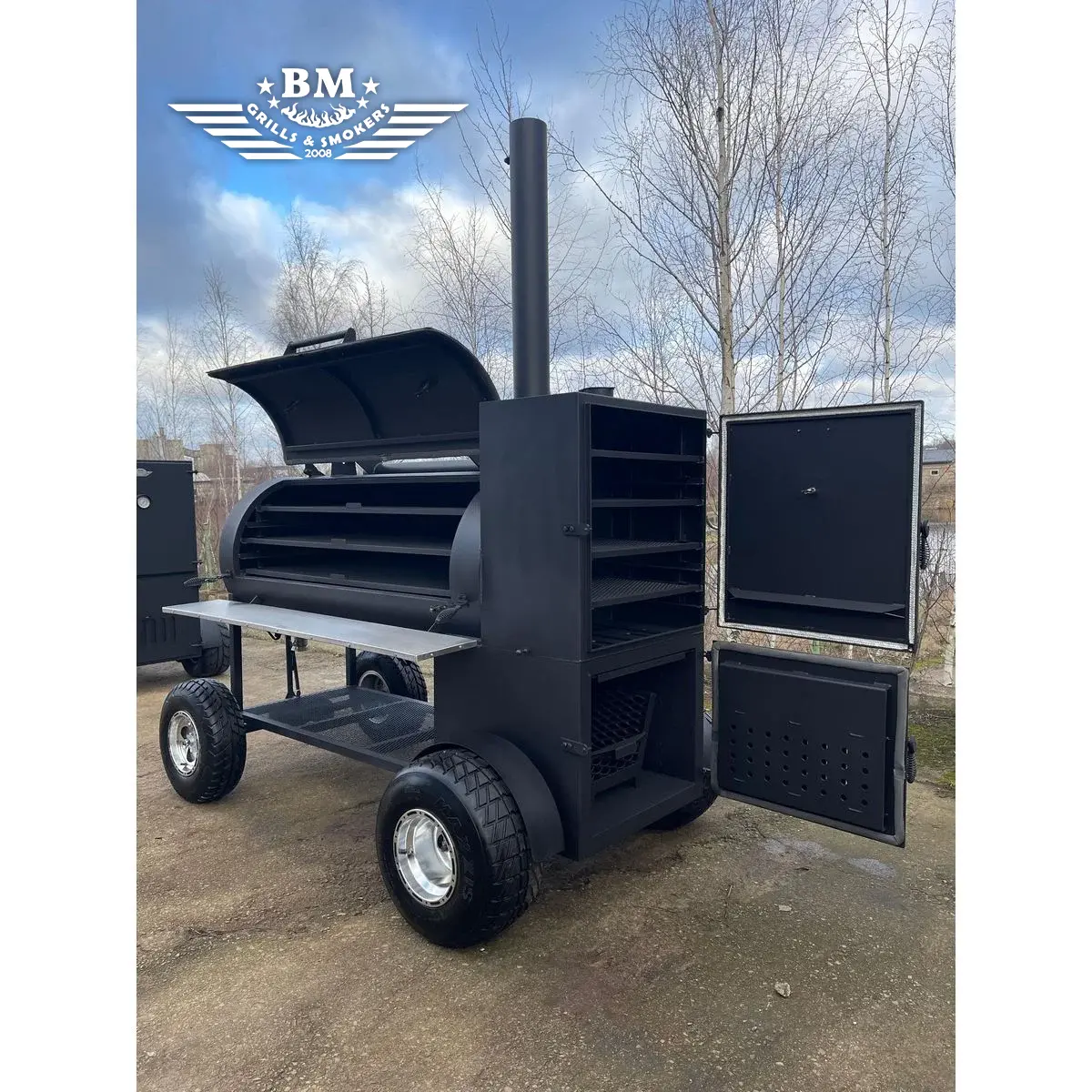 The latest version of the BMS-5 PLUS Dual chamber offset smoker XL with many improvements – now with large wheels for easier movement on grass, fields or uneven surfaces, as well as a more attractive design. The smoking / cooking chamber of the latest version of the BMS-5 is longer than in previous versions and has a wider diameter. A large cabinet-type smoking / cooking / warming chamber has been added to the back, above the firebox, an extended folding chimney, an insulated and improved firebox, a fuel bag, an improved air intake system for better air flow, a lid counterweight, a tight lid and door to prevent smoke leakage and maintain internal temperature, etc.