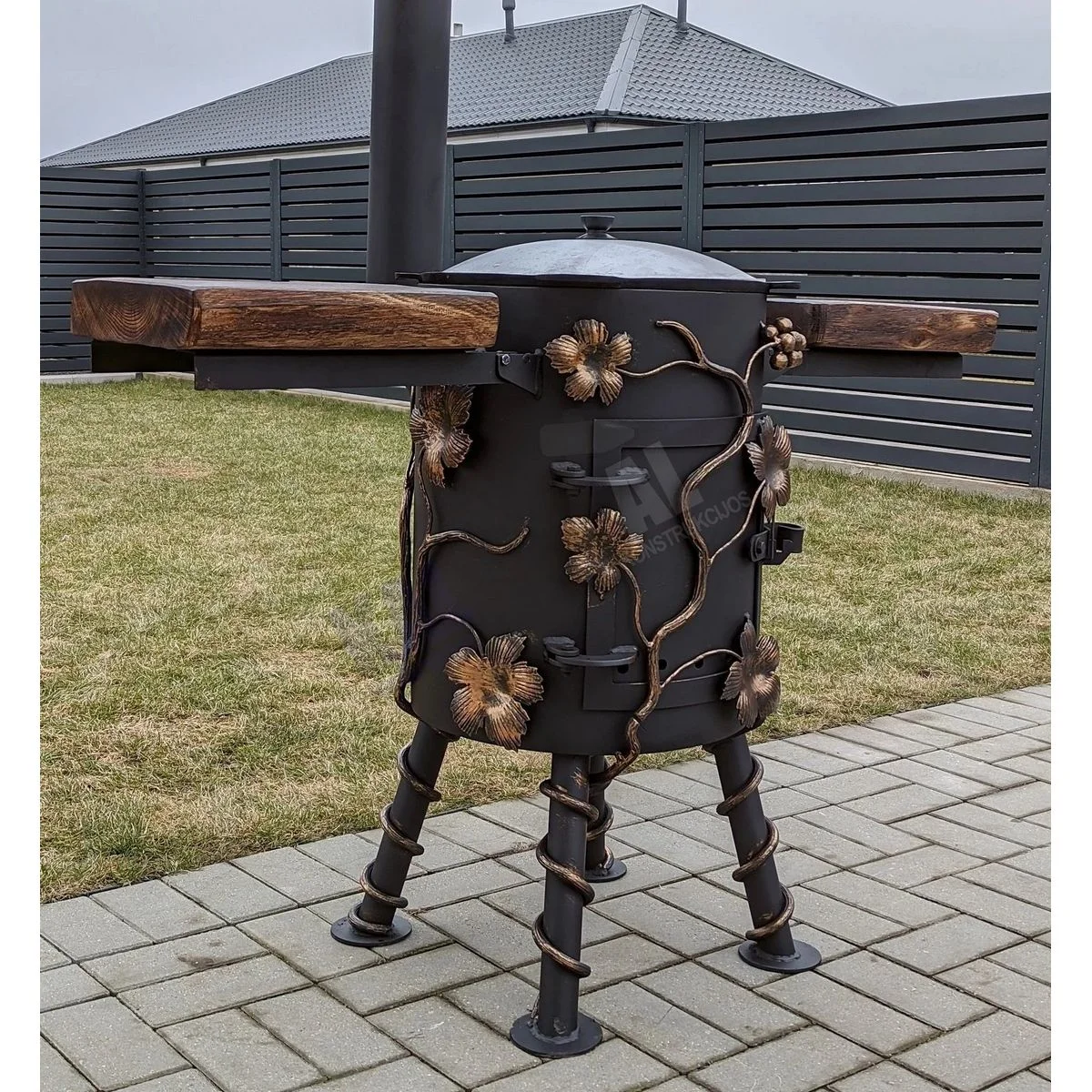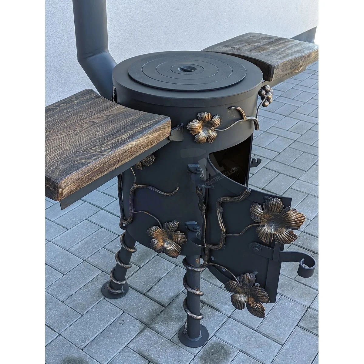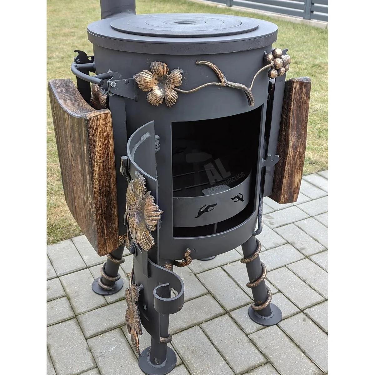 Blacksmith-style “Grape” cauldron stove with two foldable, lacquered oak shelves.