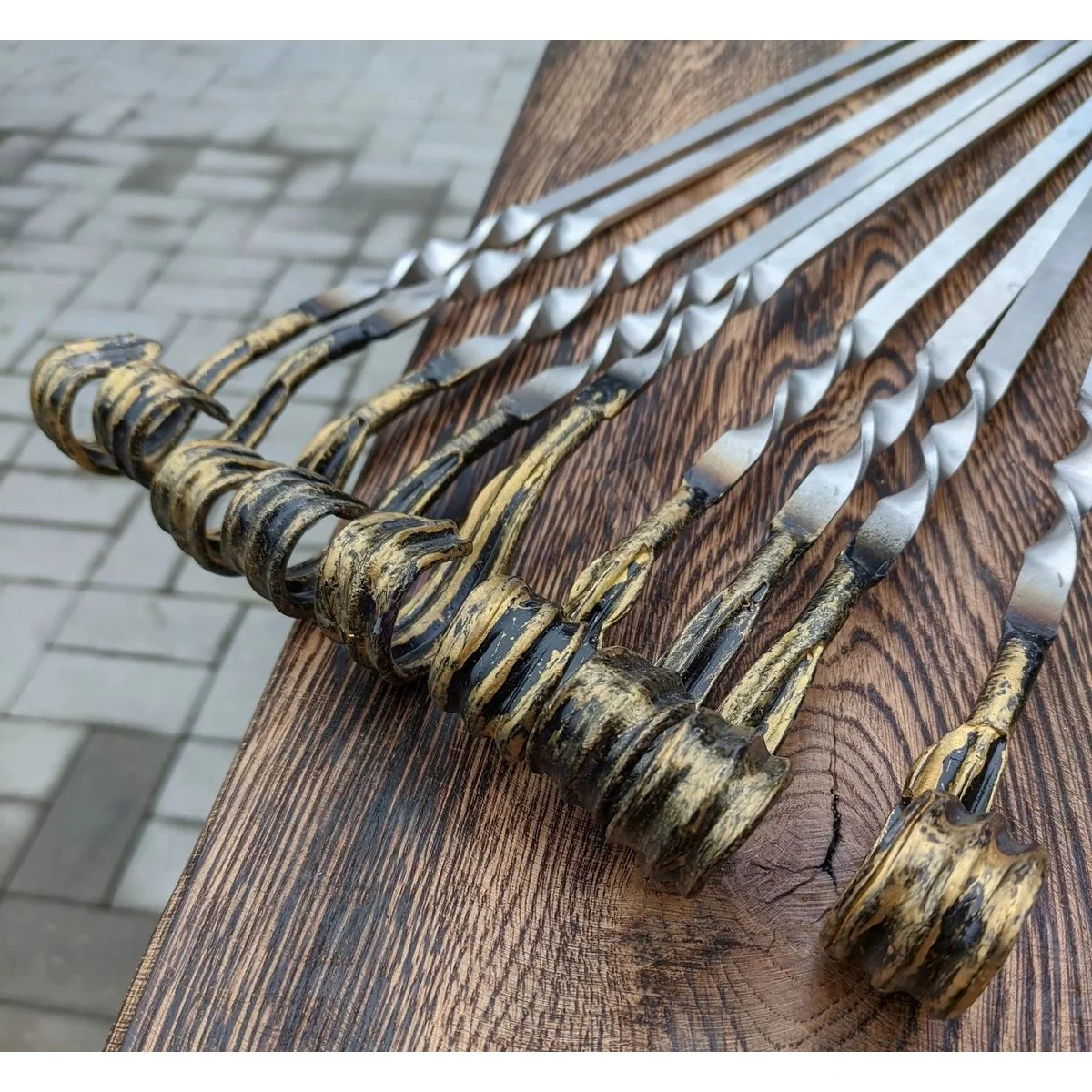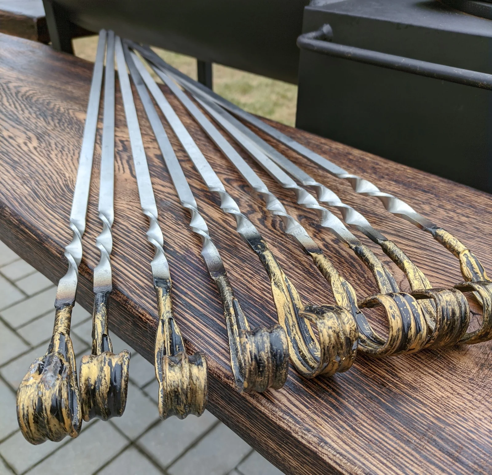 Premium 3mm thick stainless steel skewers, decorated with a blacksmith-style design.