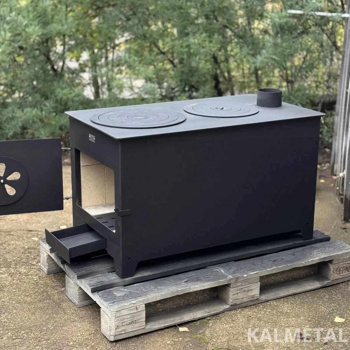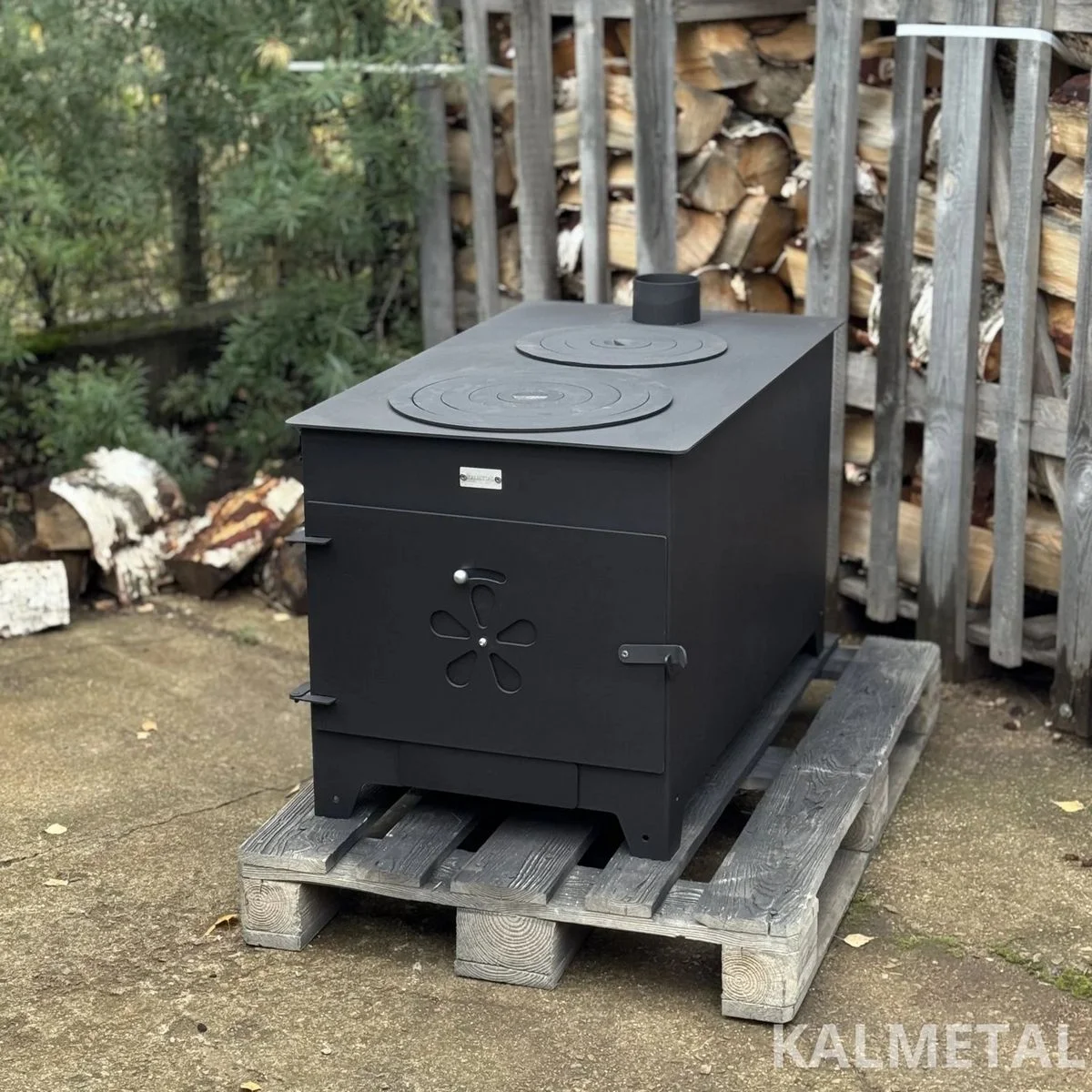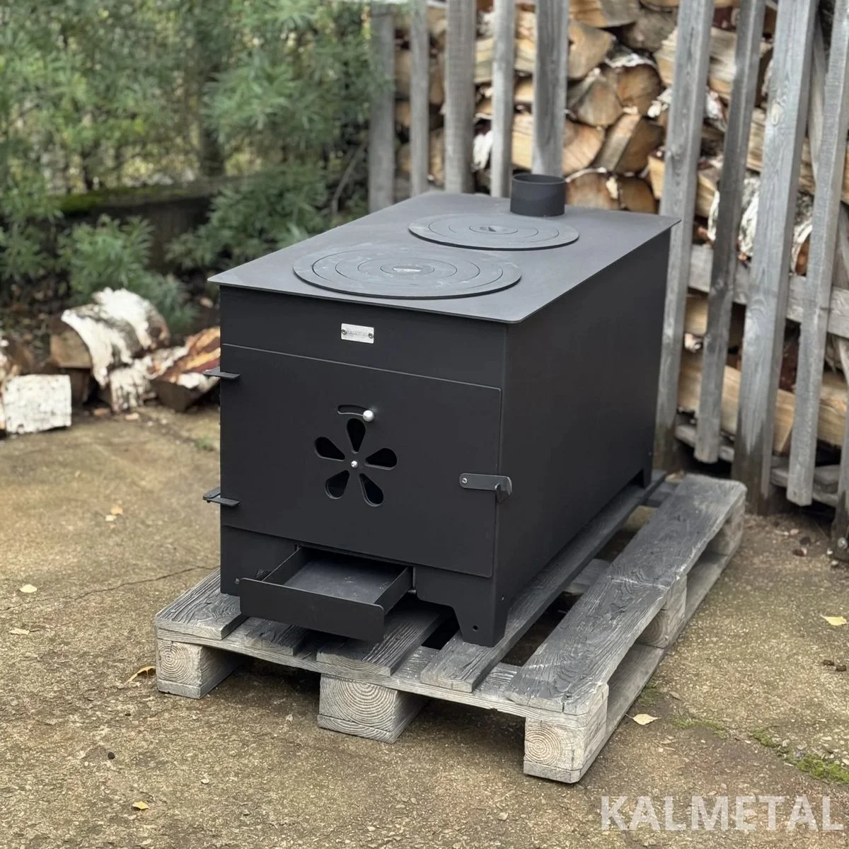 Two-ring, minimalist design, highly efficient solid fuel stove with fireclay, commonly known as a “Buržuika” – perfect for cooking as well as heating your modular cabin, garage, forest hut, terrace, or outdoor kitchen.