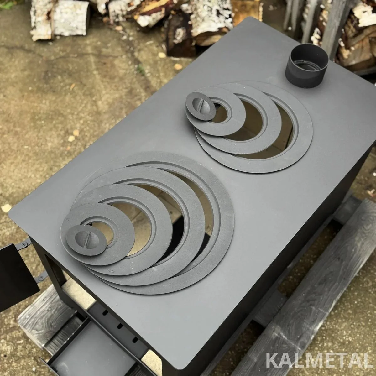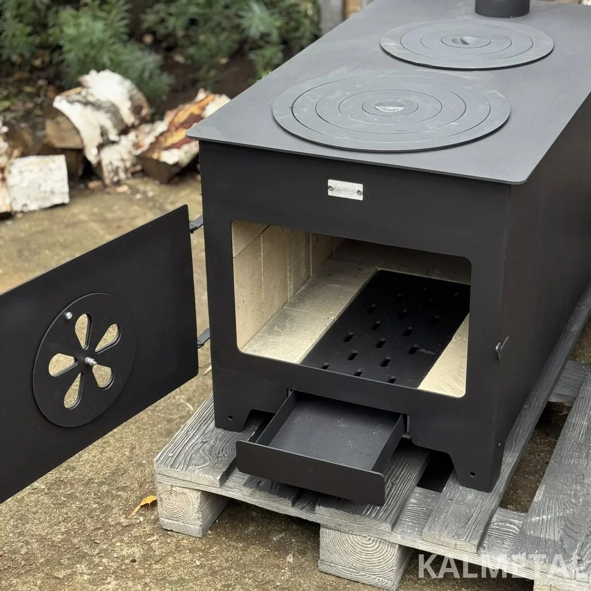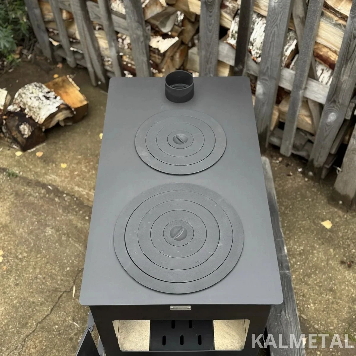 Two-ring, minimalist design, highly efficient solid fuel stove with fireclay, commonly known as a “Buržuika” – perfect for cooking as well as heating your modular cabin, garage, forest hut, terrace, or outdoor kitchen.
