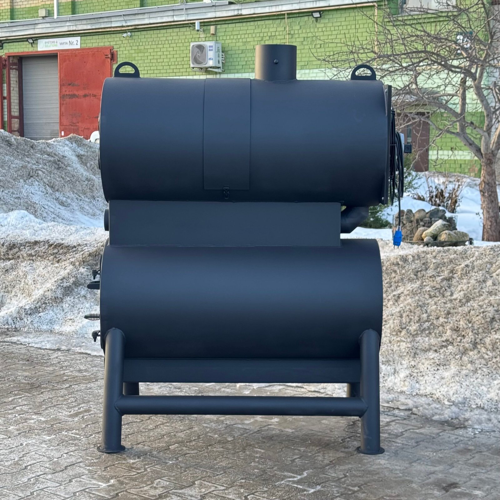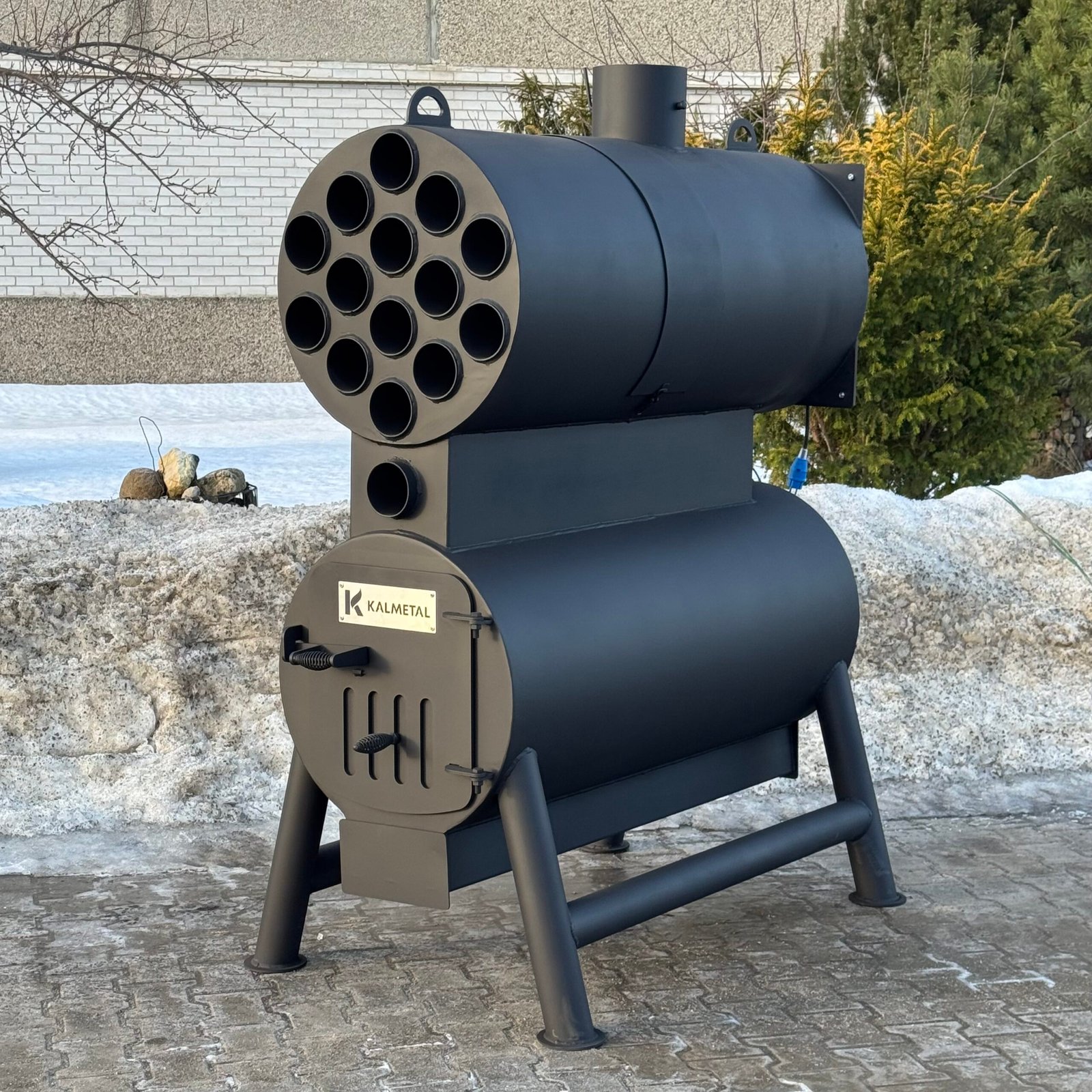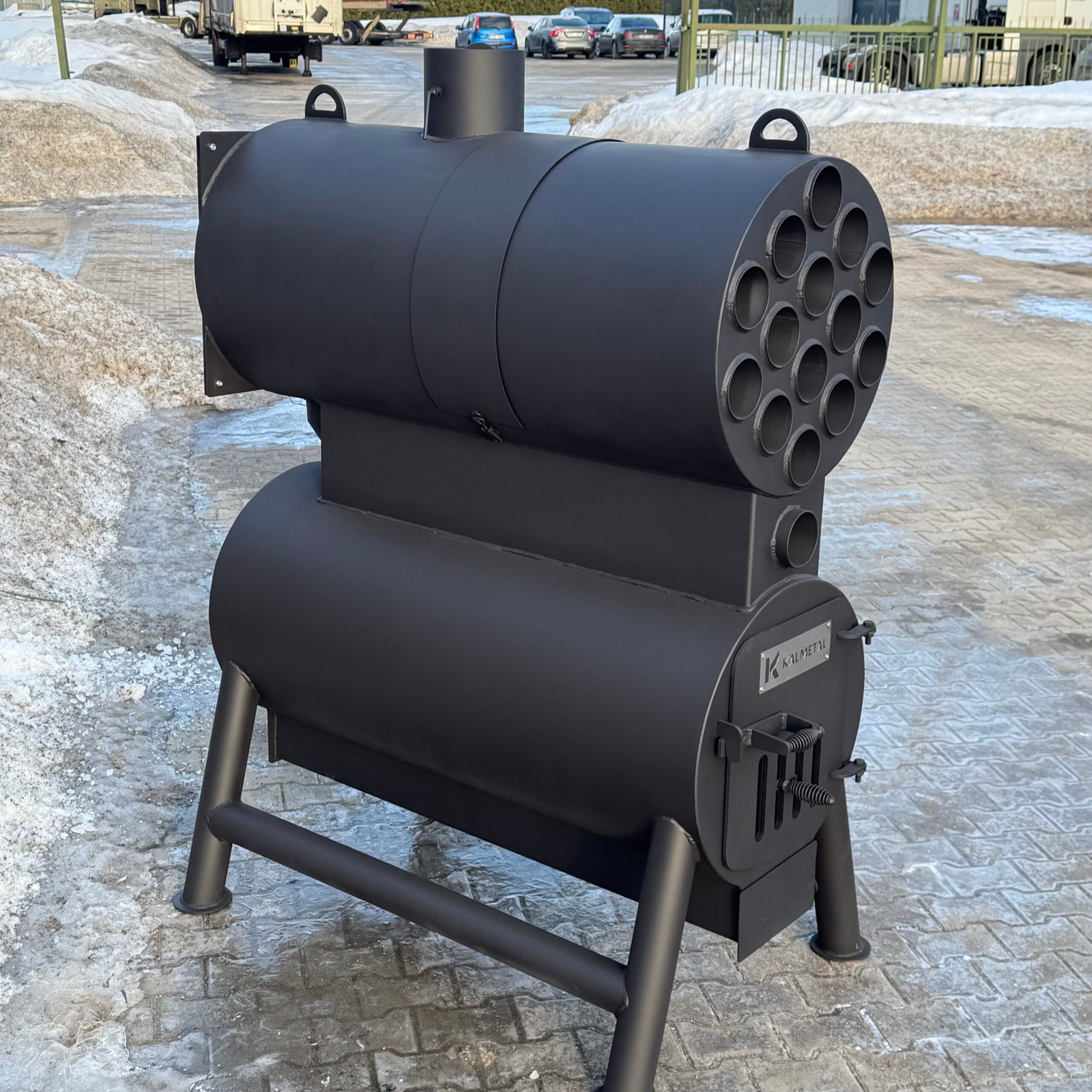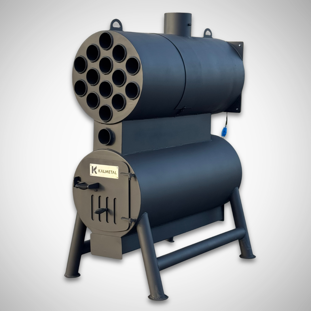 A high-power solid fuel heating stove designed for manufacturing, storage, and industrial facilities.