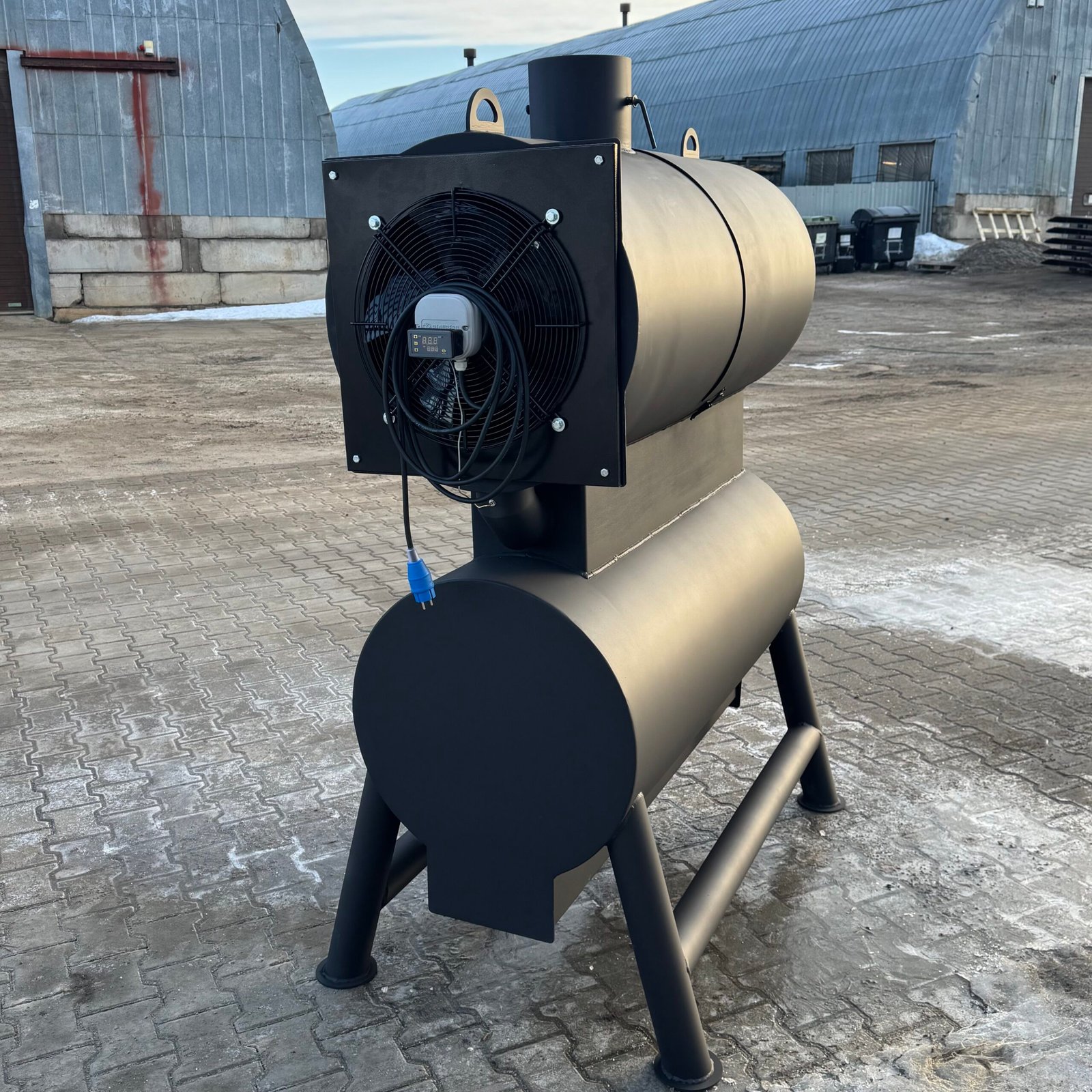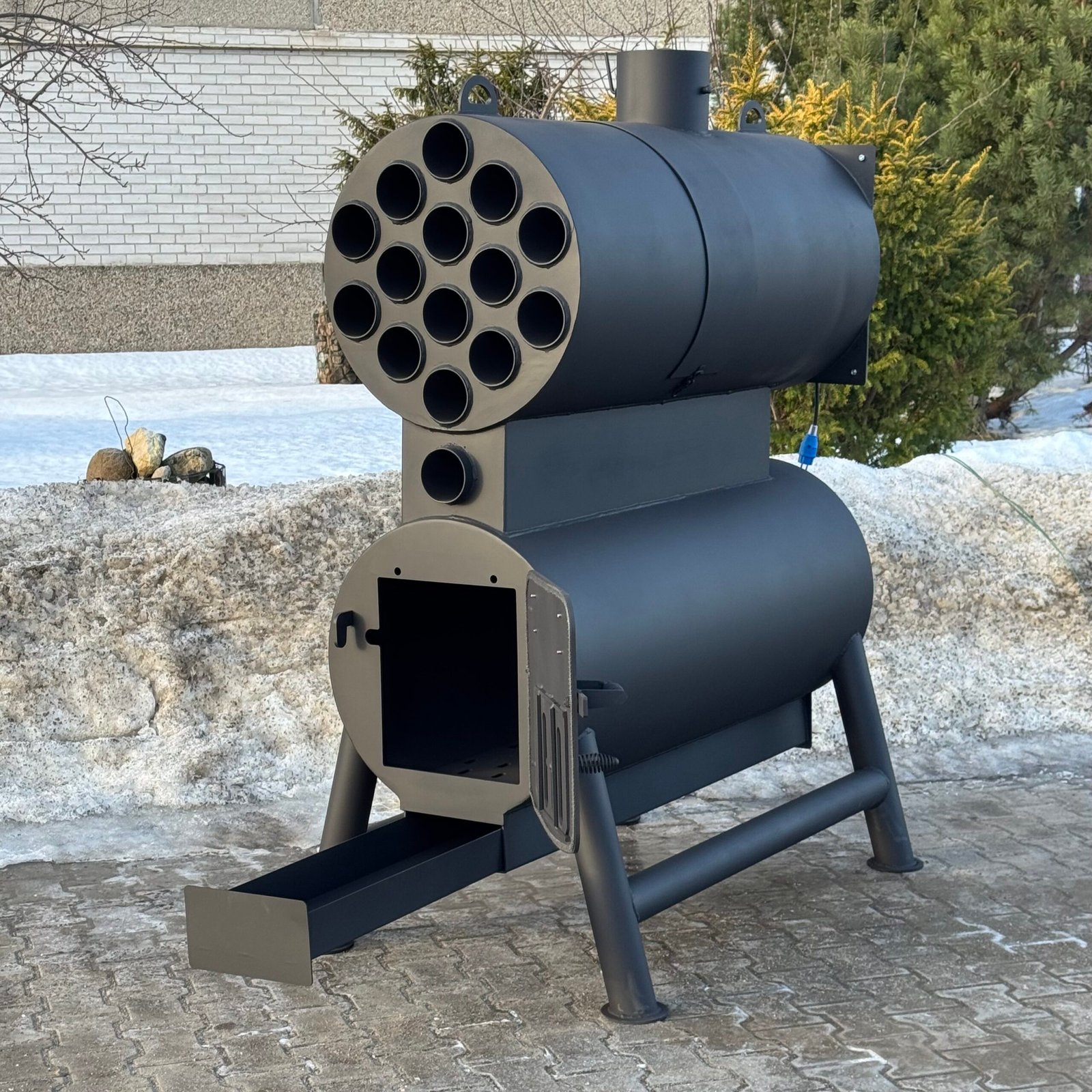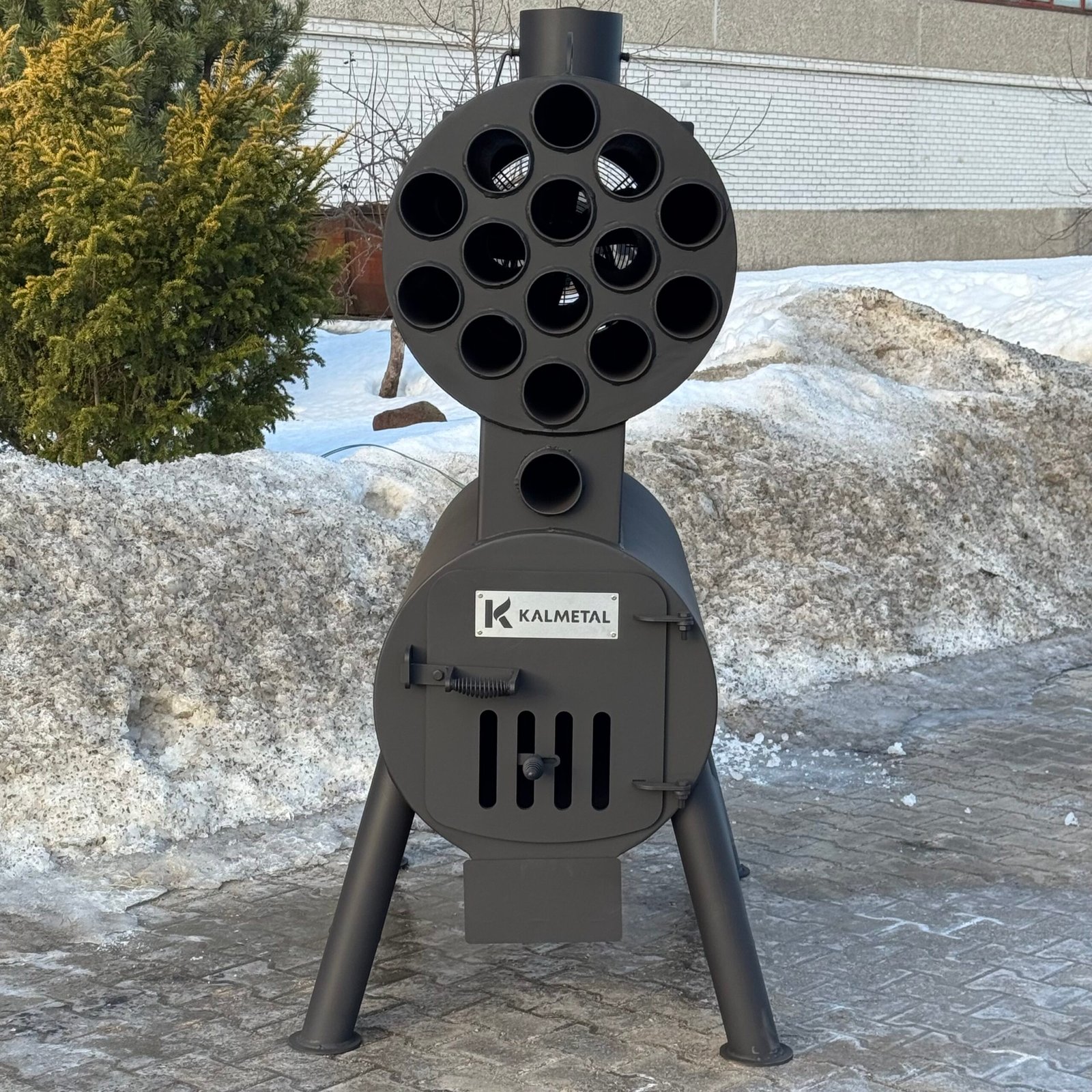 A high-power solid fuel heating stove designed for manufacturing, storage, and industrial facilities.