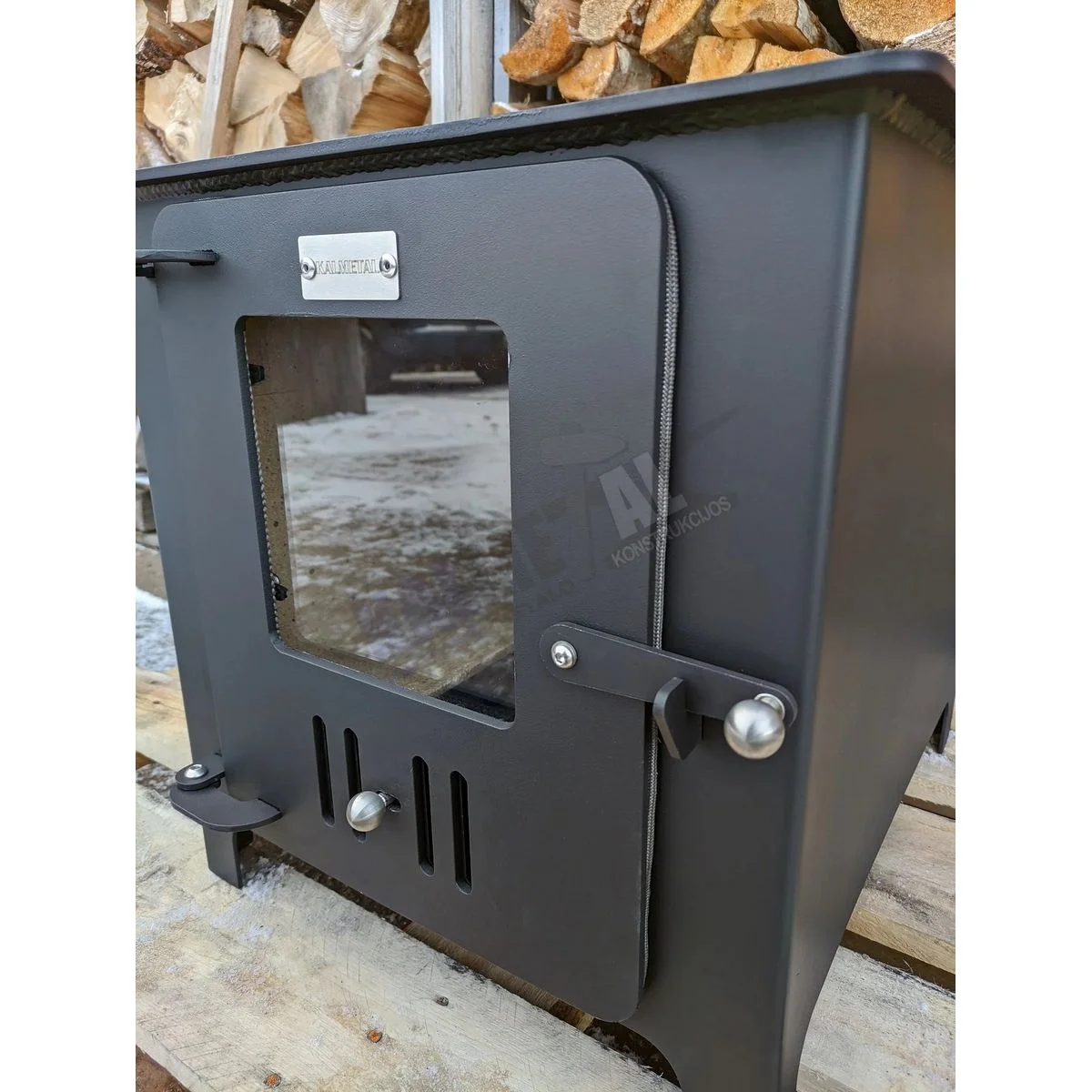 Minimalistinio dizaino ir efektyviai veikianti kieto kuro krosnelė – židinys su stiklu durelėse ir su šamotinėmis plytomis viduje. Su rinkėmis.